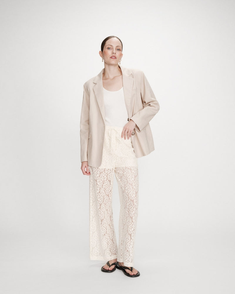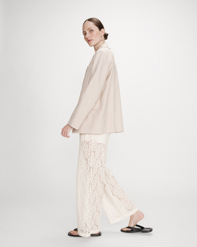 El pantalón amplio Vincent está trabajado en un encaje refinado para una silueta moderna y afirmada. El corte recto asociado a un forro hasta la mitad del muslo crea un juego de transparencia muy lindo