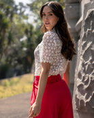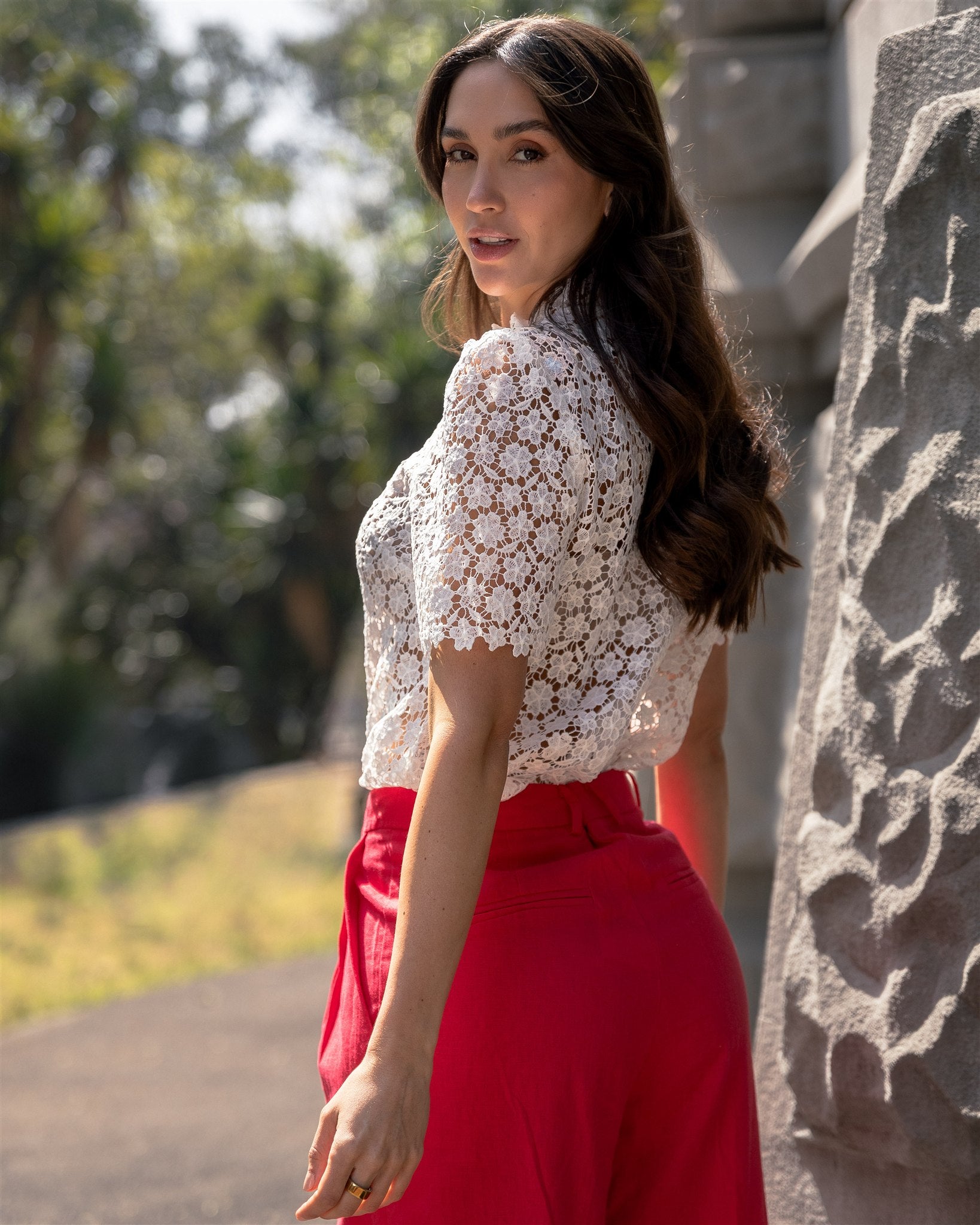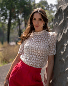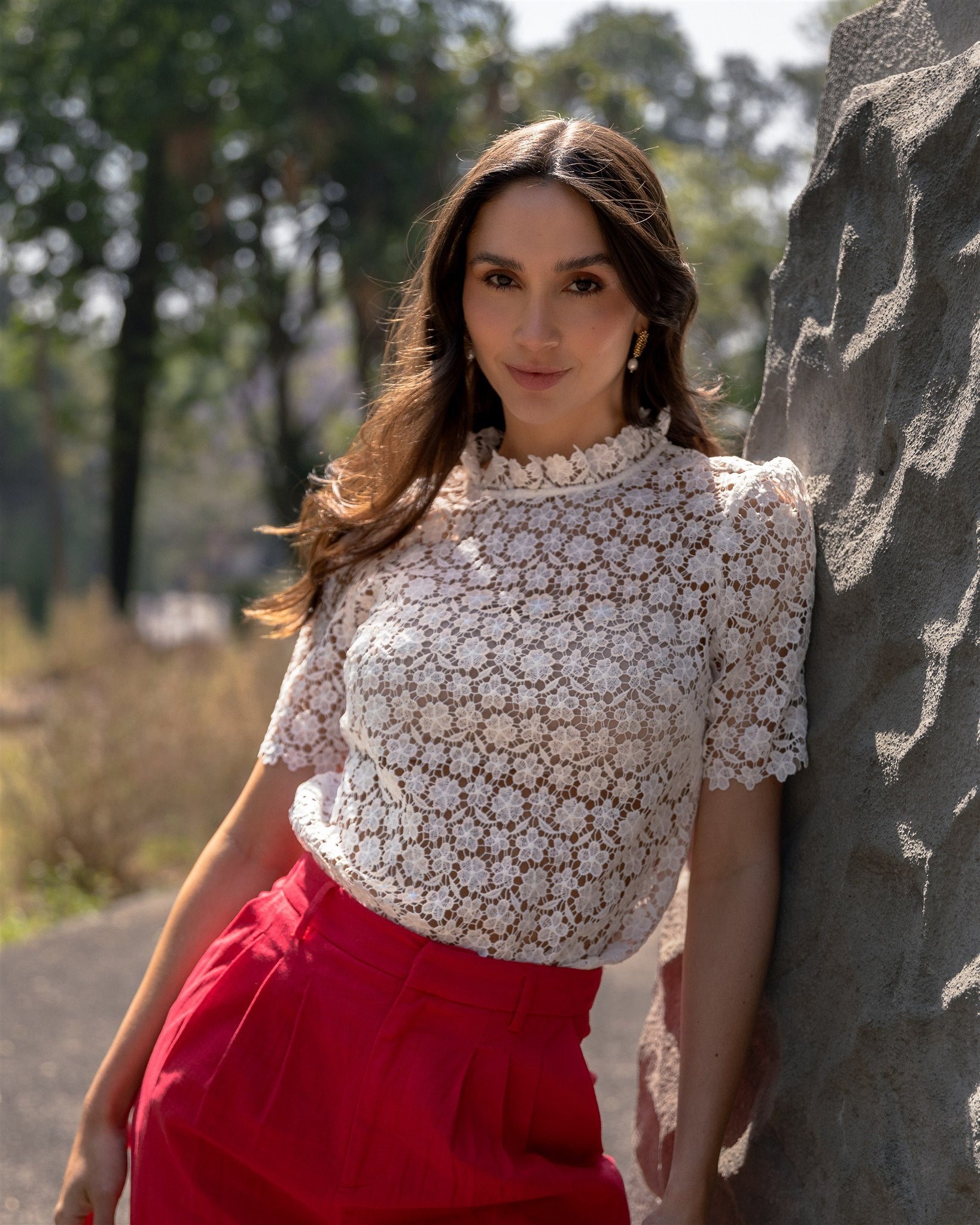 La blusa calada blanca de encaje Lucie crea una silueta elegante y super femenina. Su juego de transparencia agrega un toque muy delicado. Apertura de botón en el cuello