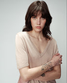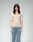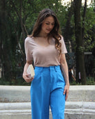 La playera de manga corta OMALIA está hecha de una tela super fluida ideal para levantar un look sencillo de día como de noche con su color rosa pálido y brilloso
