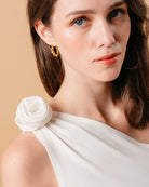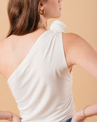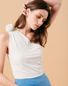 Top femenino de un hombro ornado con una flor, color blanco con fruncidos.