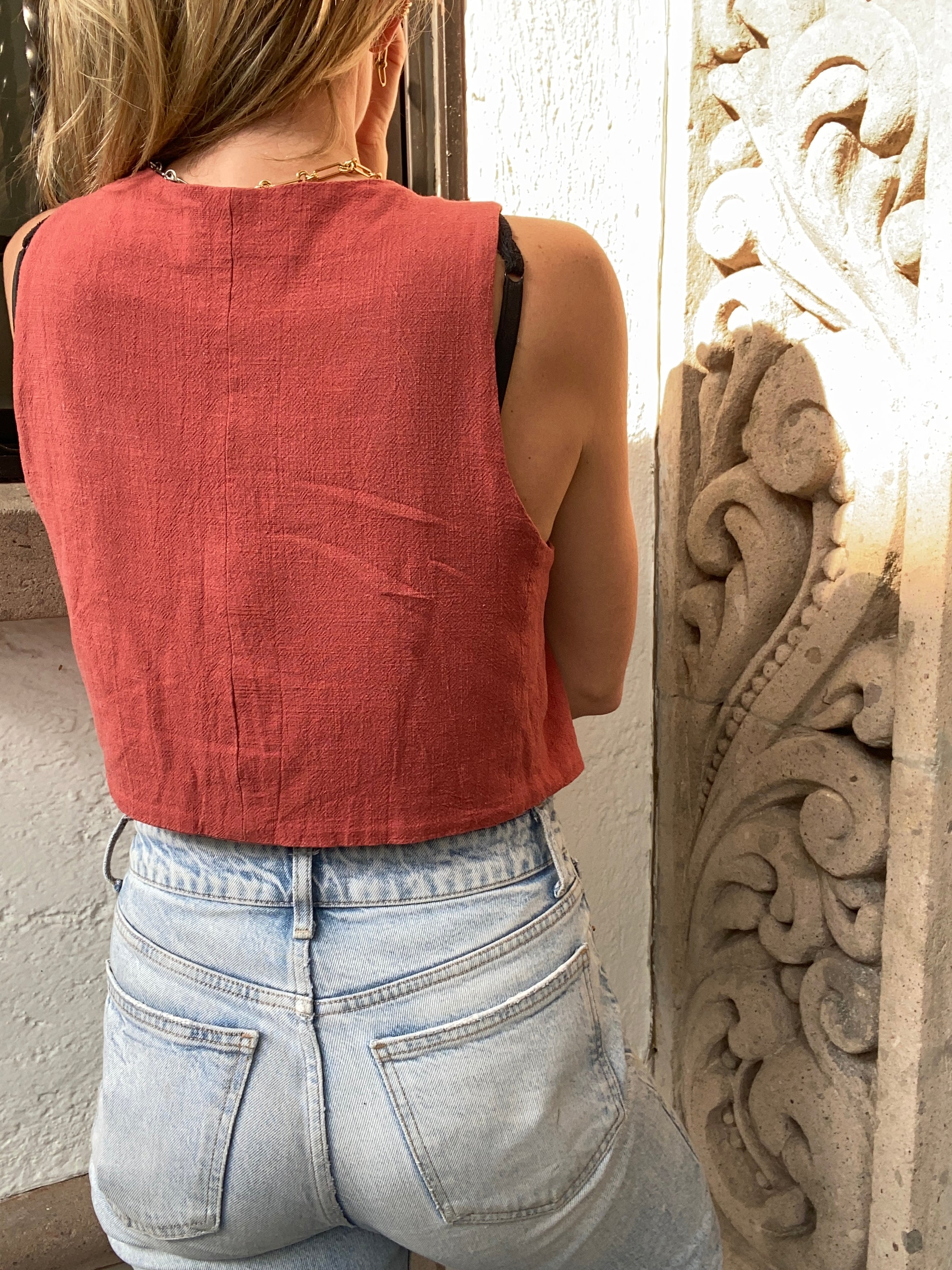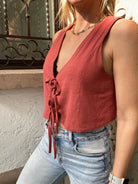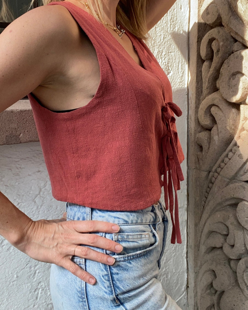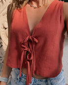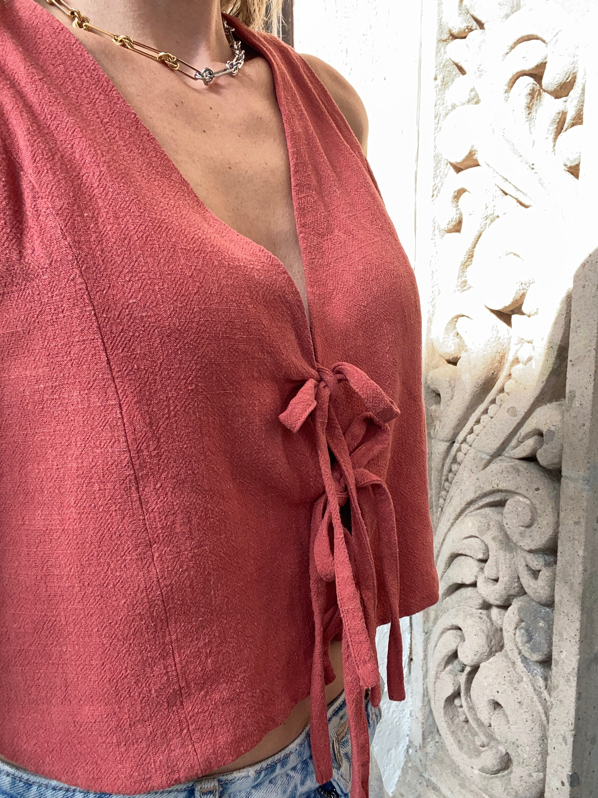 Fabricado con fibras naturales, el top de lino y rayón Rubens es un modelo muy agradable de usar. Su escote V pronunciado está sublimado por los 3 vinculos de amarre, aportando femenidad y ligerez. El corte es elegante y minimalista para crear una silueta chic y moderna, y queda ideal con una falda amplia o unos jeans.