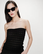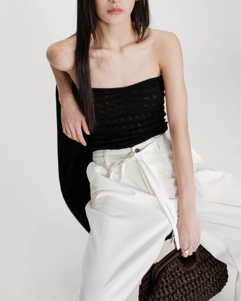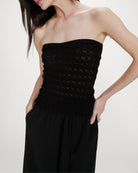 Tejido en un punto amplio, el top bustier Valazzio juega con transparencias para una silueta afirmada y moderna. El escote corazón sublimado por los frunces se mazcla con un corte ajustado para hacerlo una pieza ultra femenina.