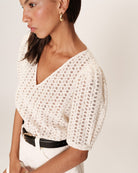 El top de cuello V Romeo es una pieza romántica, confeccionada de bordado inglés, que propone una silueta femenina y elegante. El corte recto favorece las curvas de todas las mujeres mientras la manga corta lo hace ideal para el verano. Los detalles muy elaborados, como la apertura con botón o las mangas ligeramente abulonadas, lo hacen una pieza refinada y sofisticada.