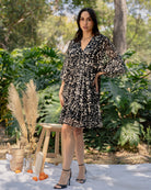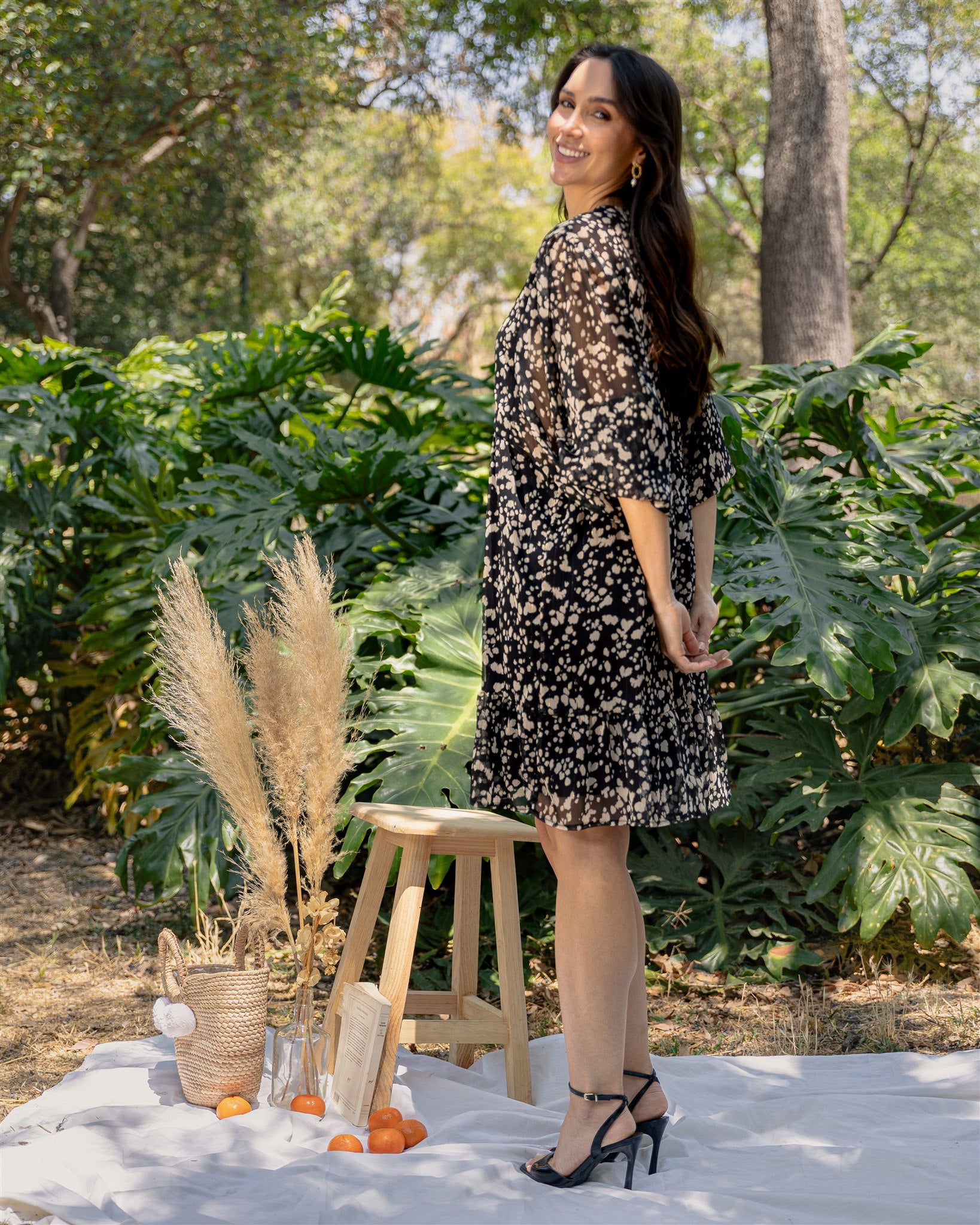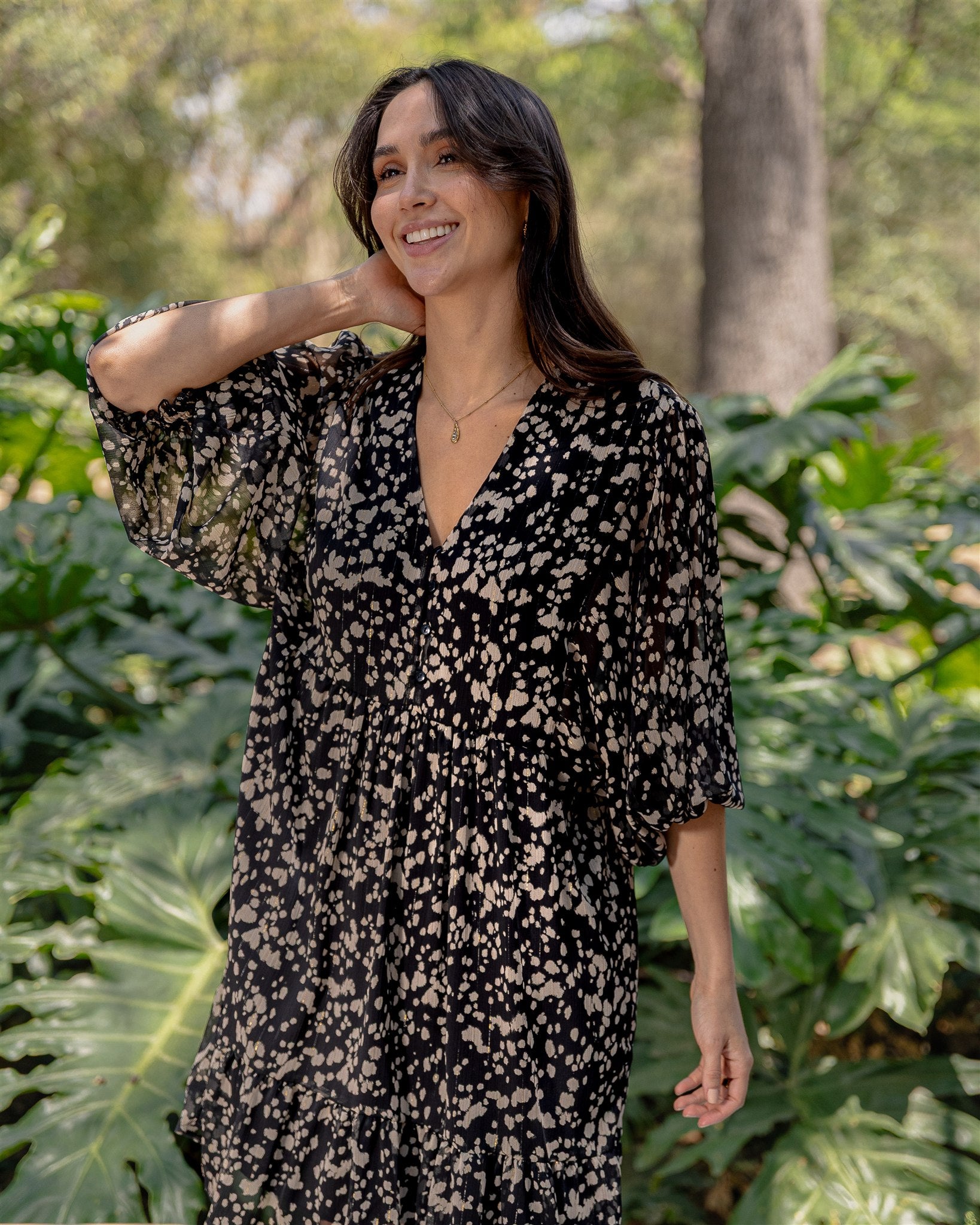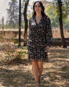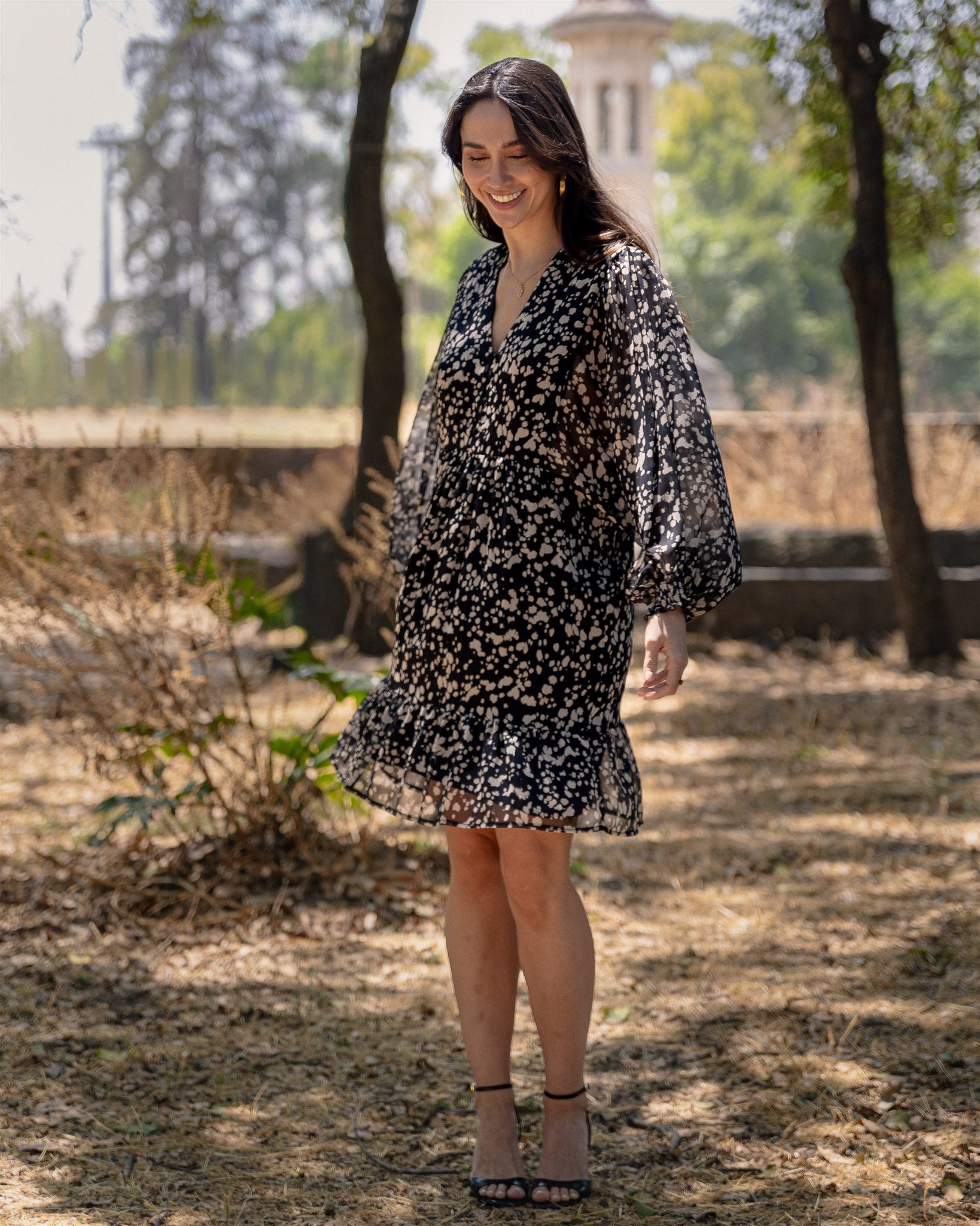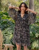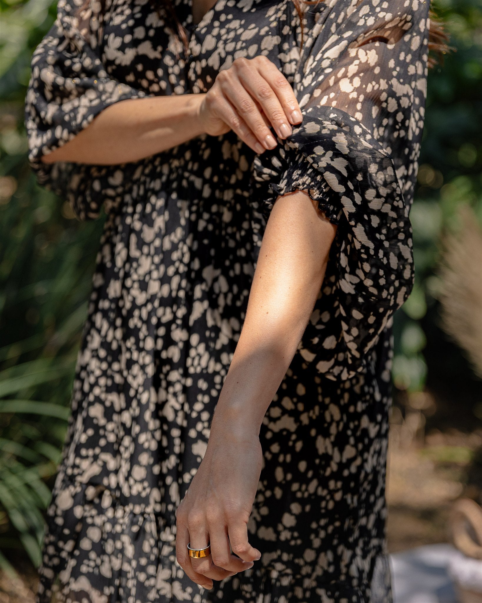 Vestido boho romántico icónico: nos encanta su tela ultra fluida y su manga abullonada con un resorte ancho muy escultural en muñeca. A llevar con sandalias en verano y lentes aviator para un estilo boho retro divino