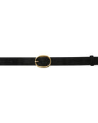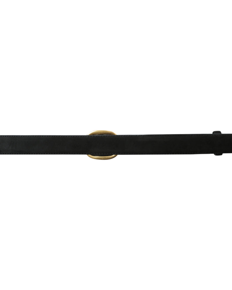 Cinturón de ante negro delgado con hebilla de metal dorado. Ancho 3 cm. Largo 110cm