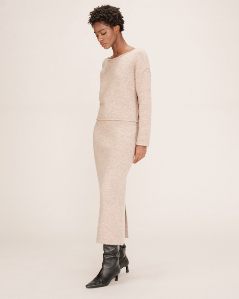 El suéter de punto Tamino agrega a la colección una pieza caliente y tendencia. El corte ancho y boxy asociado a un escote barco para un look femenino y relajado.