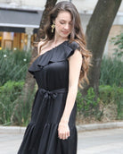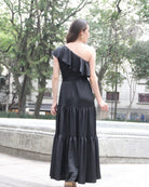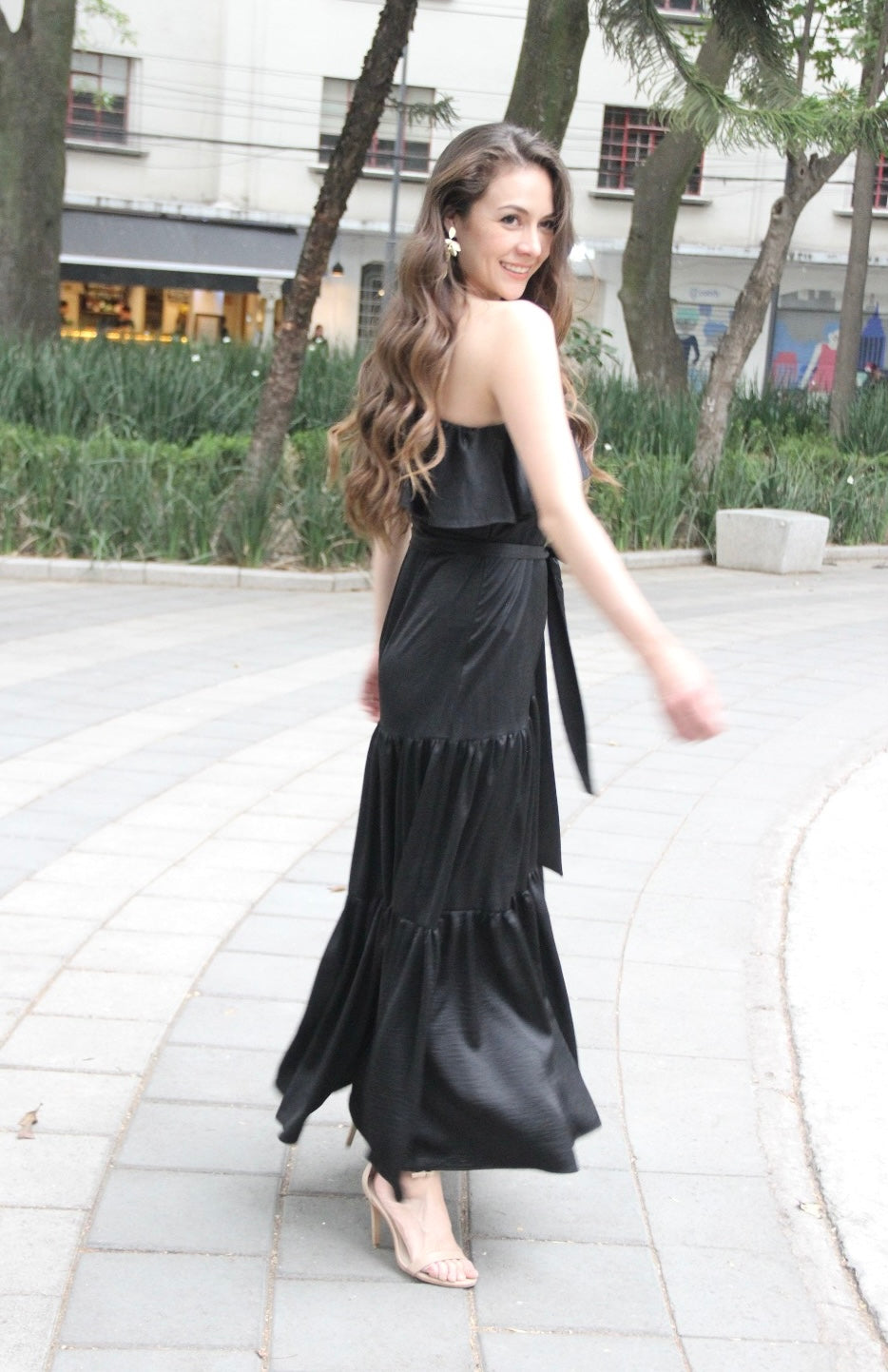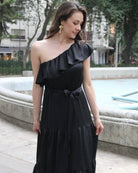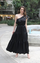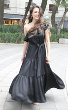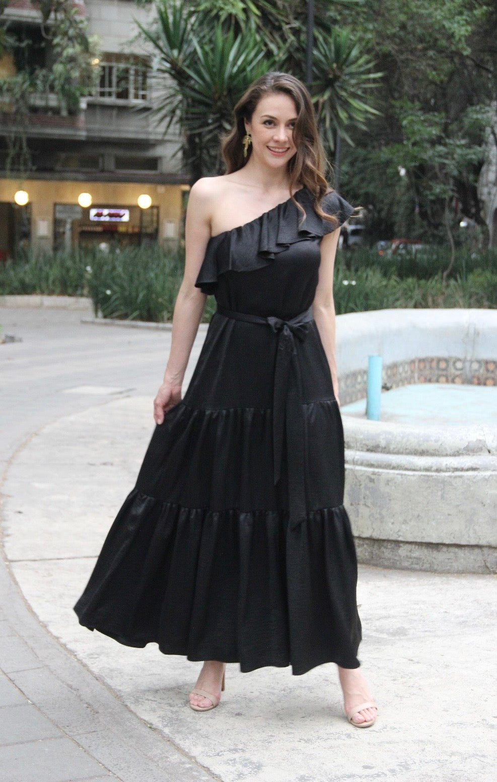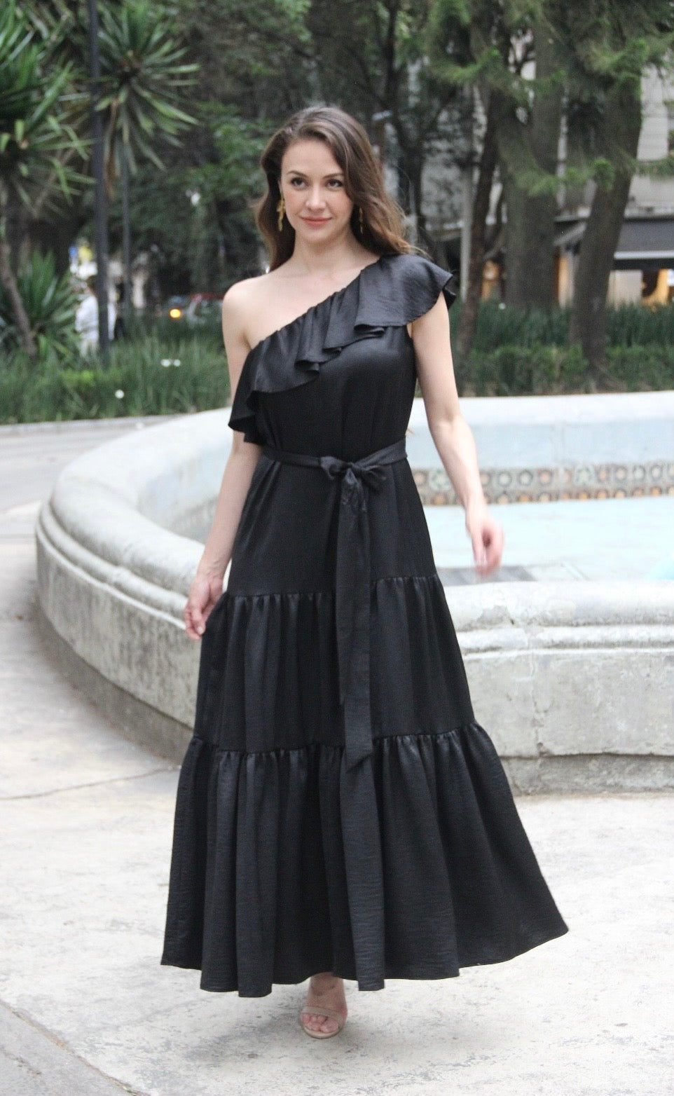 Vestido largo de satin negro elegante con olanes, corte asimétrico y cinturón para marcar la talla