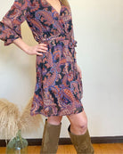 El vestido corto Lia es una pieza femenina ideal para estar cómoda y femenina a la vez. Su corte fluido con un suave forro de rayón lo hace muy agradable de llevar, el escote V cruzado se adapta al pecho, el elástico viene marcar la cintura.