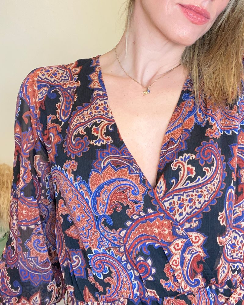 - Escote cruzado en V muy favorecedor