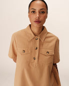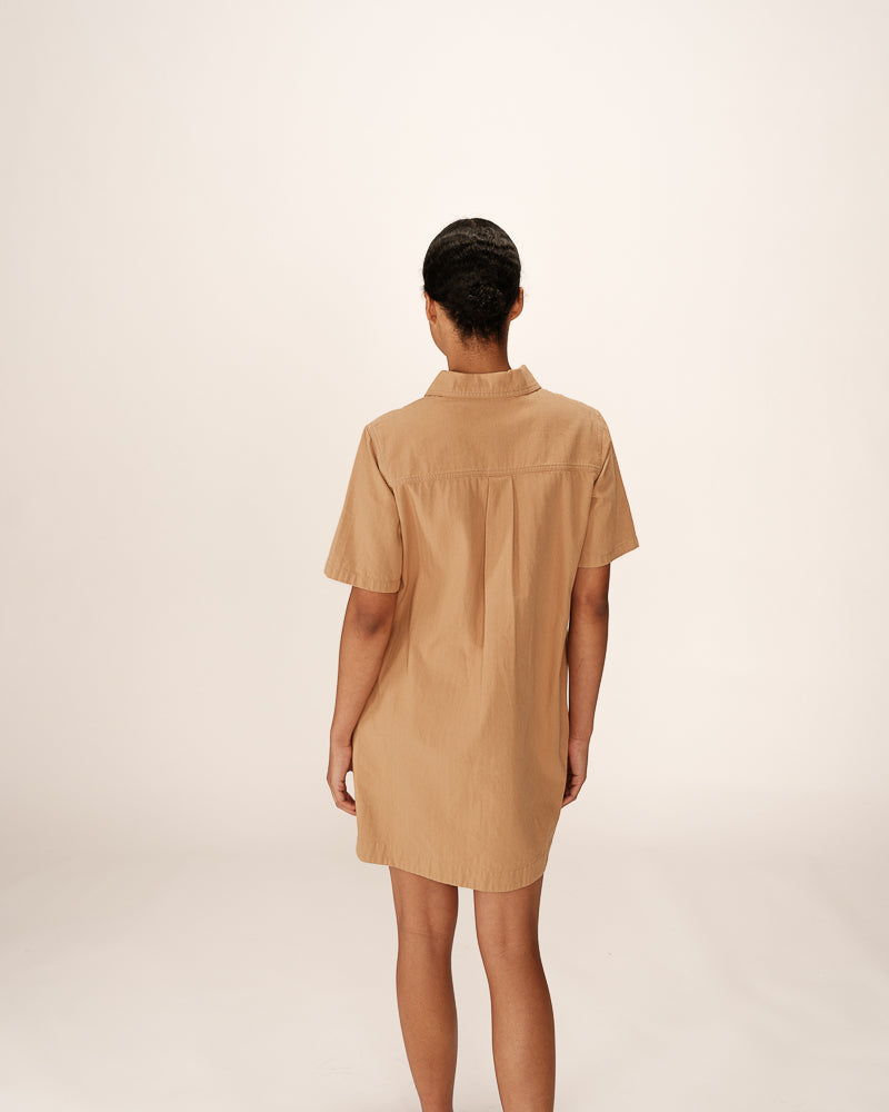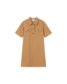 Vestido baby doll de mezclilla 100% algodón con bolsos laterales escondidos, bolsos de ribete y cuello solapa.