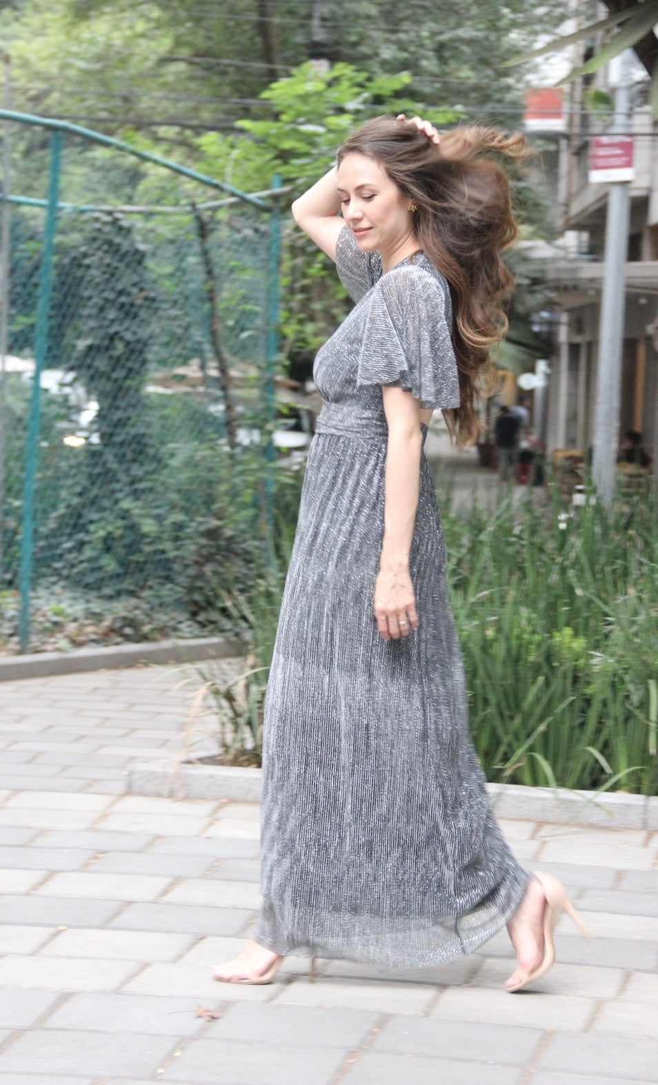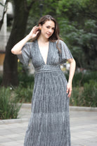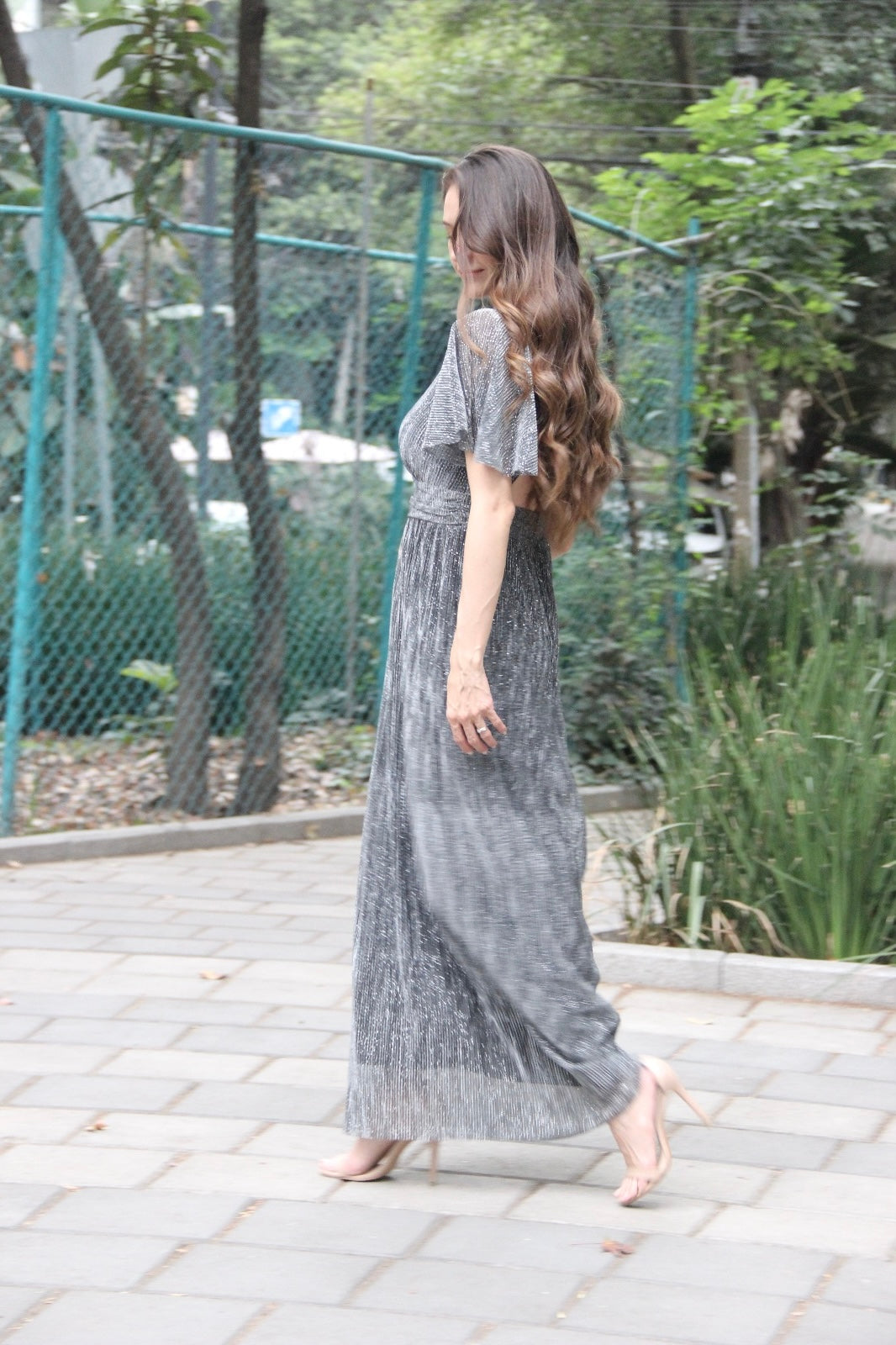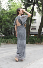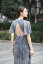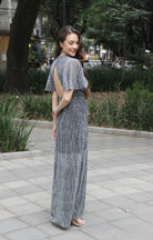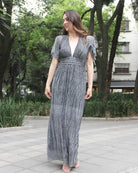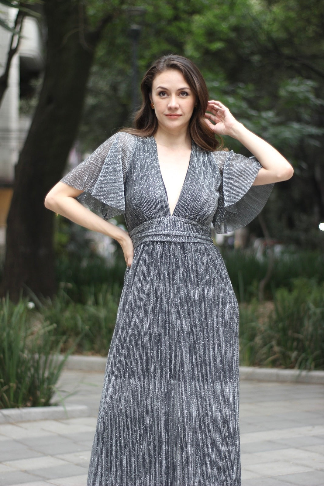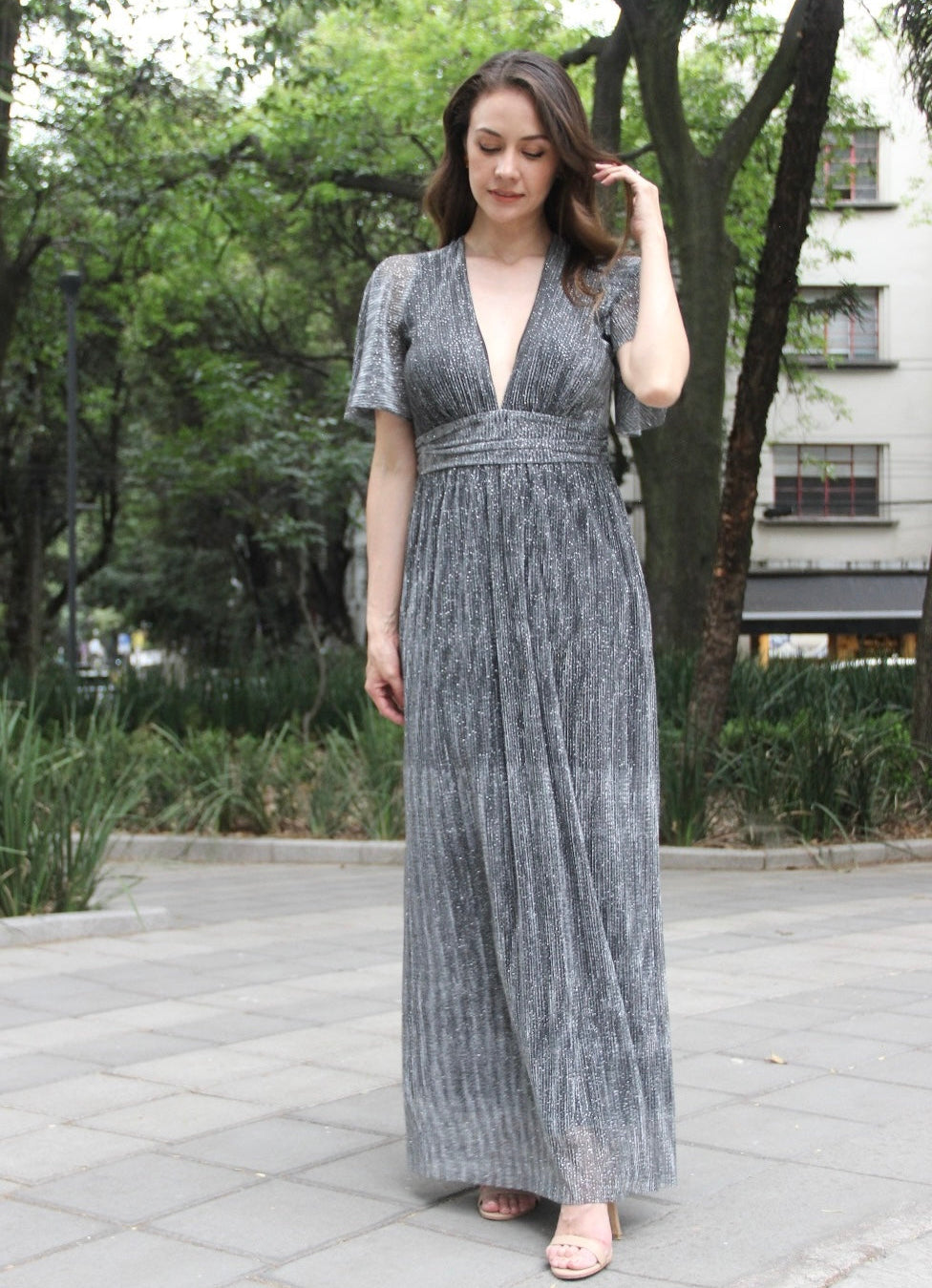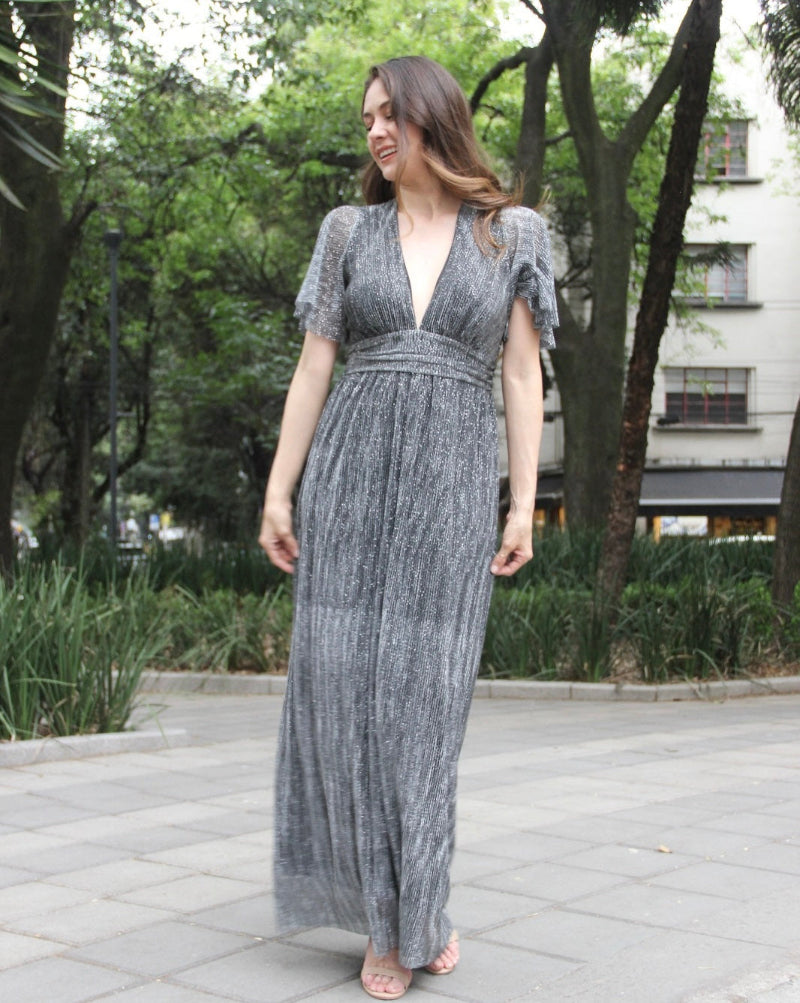 - Vestido largo de mangas cortas fluidas con escote profundo y cierre en espalda