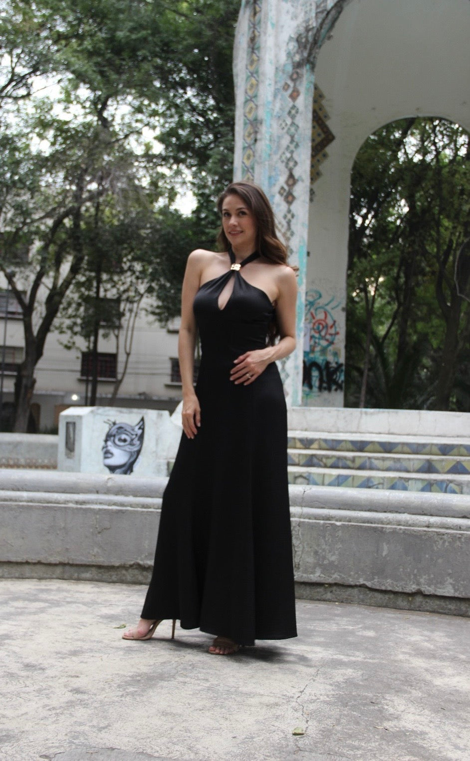 - Vestido sirena con escote ajustable con una joya dorada