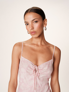 - tirantes delgados ajustables y escote en V con vinculo a amarrar adelante