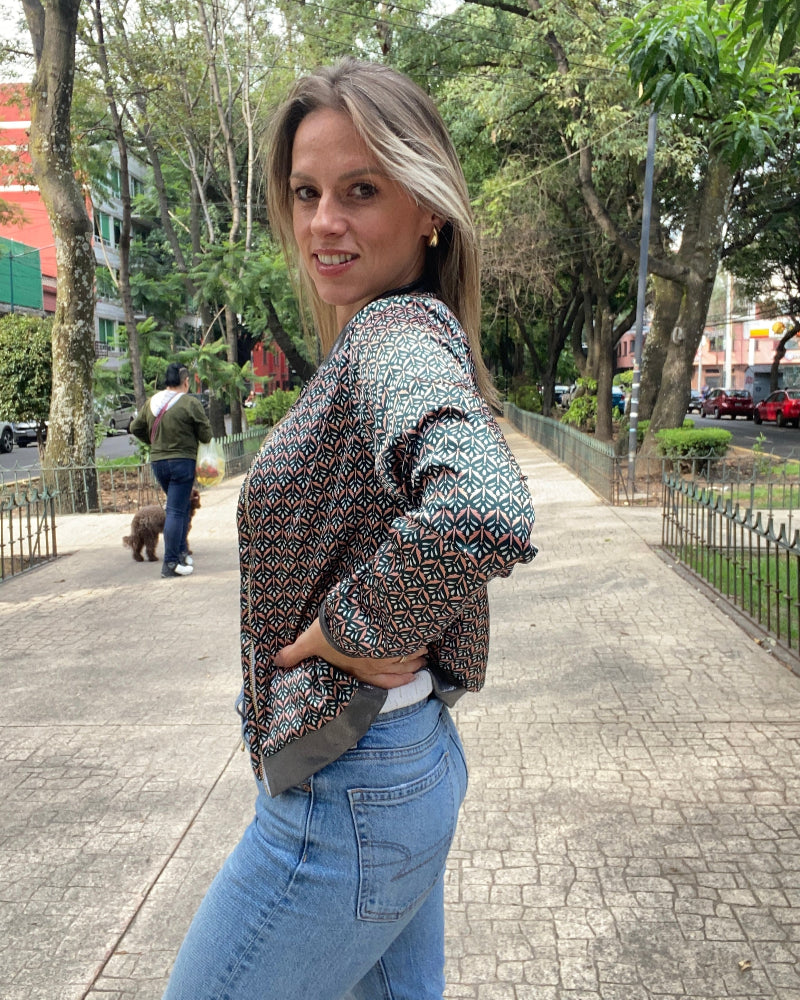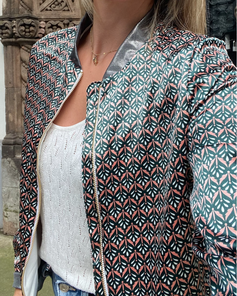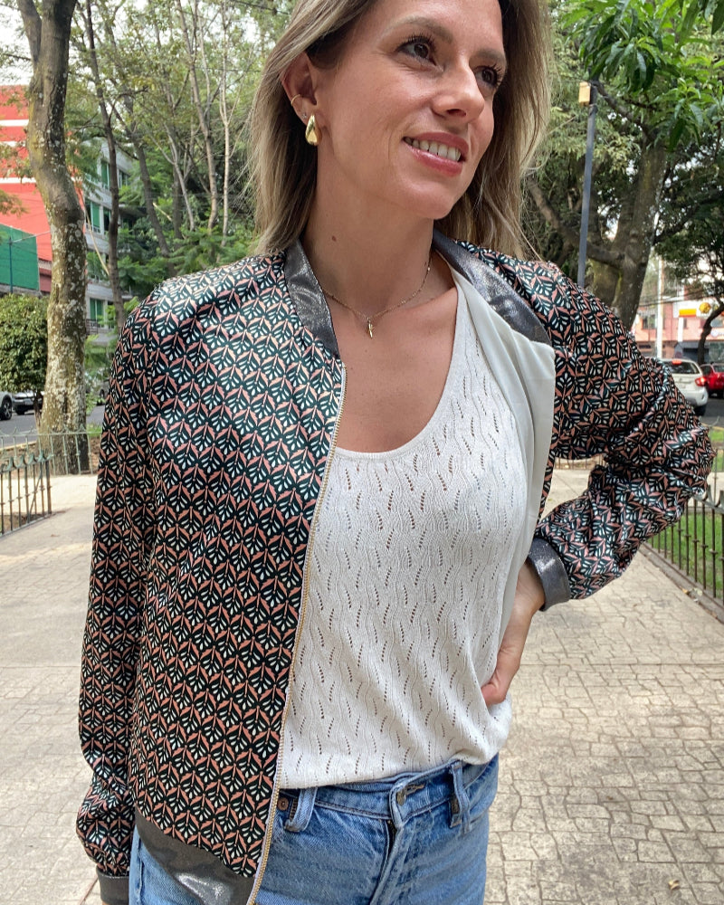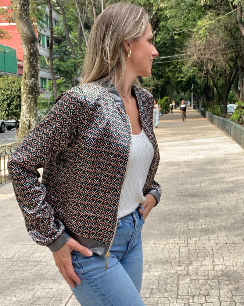 Chamarra bomber de mujer estampada, super ligera y ultra moderna. Nos encanta que no se arrugue y se puede llevar en una bolsa para cualquier cambio de clima